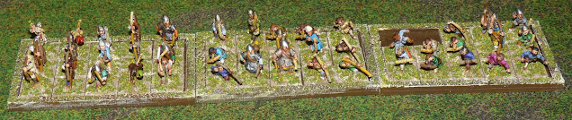 | Two Dragons Vikings and Normans with two Asgard 15mm barbarians towering over the others at the back |